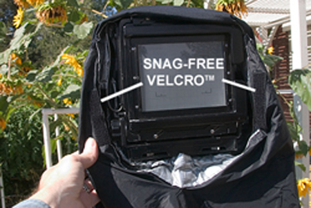 All new 4x5 and 5x7 BLACKJACKET™s have strips of "snag free" Velcro™ sewn into their neck to hang the BLACKBAG™ from. |